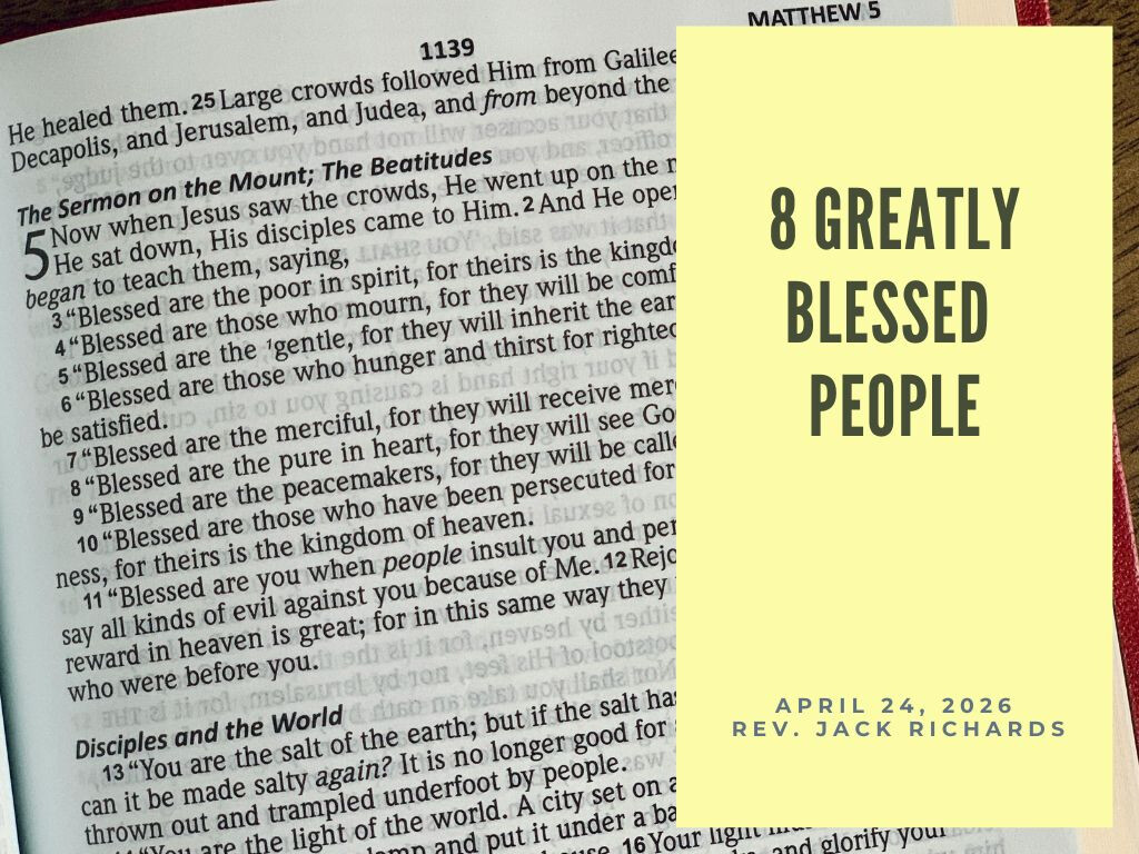 The description of the 8 types of greatly blessed people is identified in Matthew 5:3-11. This part of Christ’s sermon is called the Beatitudes. Jesus taught that these are “attitudes to be.” They are opposite to what most people are looking for, but they lead you to experiencing genuine happiness.